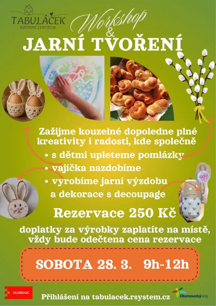 Odpoledne plné tvoření a radosti, kde si společně s dětmi vyrobíme jarní výzdobu a dekorace, upleteme pomlázky a nazdobíme vajíčka.