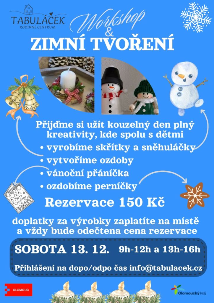 Přijďte si užít kouzelný den plný tvoření. Vyrobíme si skřítky a sněhuláčky, ozdoby, vánoční přáníčka a ozdobíme perníčky. Rezervace činí 150,- Kč, přičemž doplatky za výrobky zaplatíte na místě a vždy bude odečtena cena rezervace.