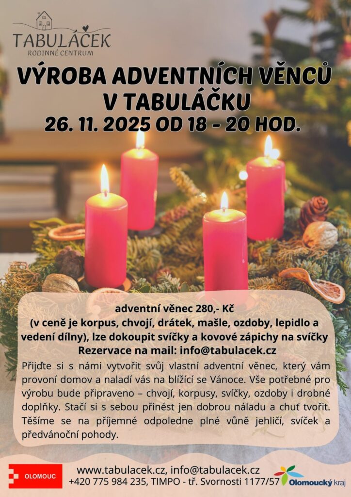 Přijďte si s námi vyrobit svůj adventní věnec. Cena 280,- Kč (v ceně je korpus, chvojí, drátek, mašle, ozdoby, lepidlo a vedení dílny). Lze dokoupit svíčky a kovové zápichy na svíčky.
