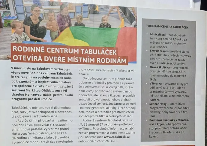 Naše Rodinné centrum Tabuláček se objevilo v Olomouckých listech! Máme velkou radost, že si redakce všimla našeho nového prostoru i aktivit pro rodiny z Tabulového Vrchu. V článku se dočtete o tom, proč Tabuláček vznikl, jaké programy nabízíme a jak chceme být místem, kde se rodiče i děti cítí vítaní. Děkujeme za podporu – moc si toho vážíme!